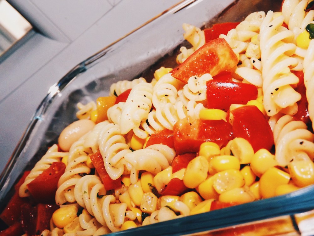 - Häll i grönsakerna och bönorna i en bunke tillsammans med pastan